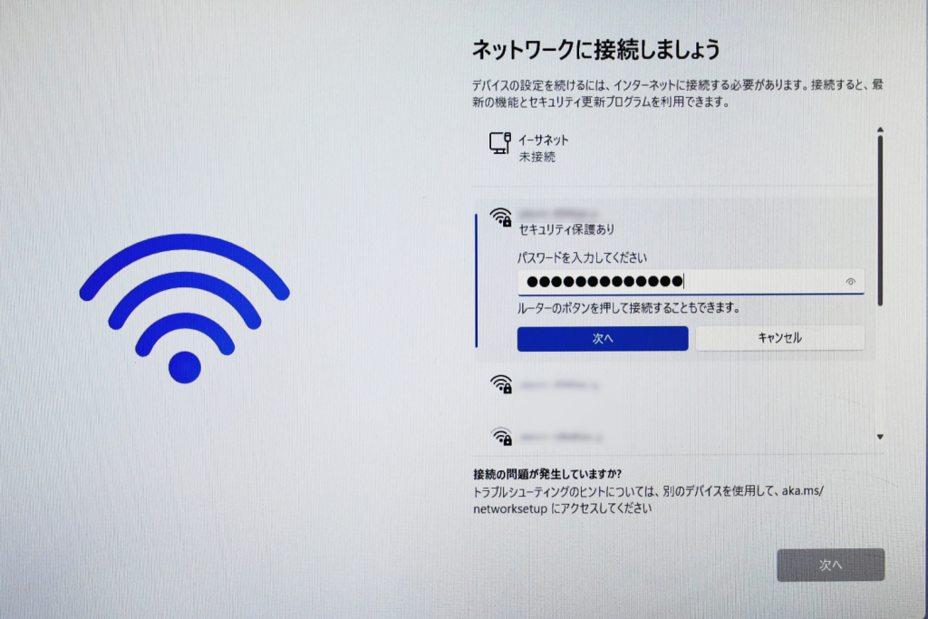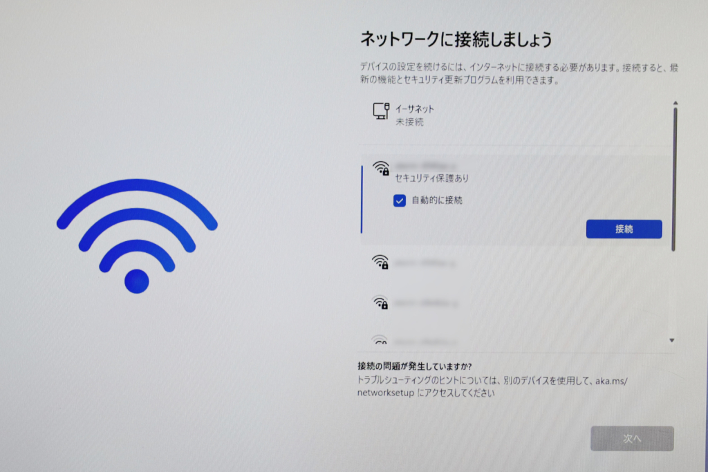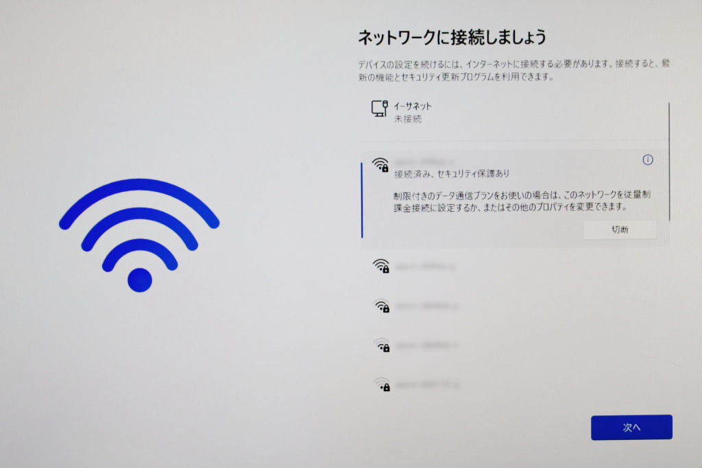 ネットワークに接続します。このノートPCは有線LANコネクタがないので、無線Wi-Fiで接続します。