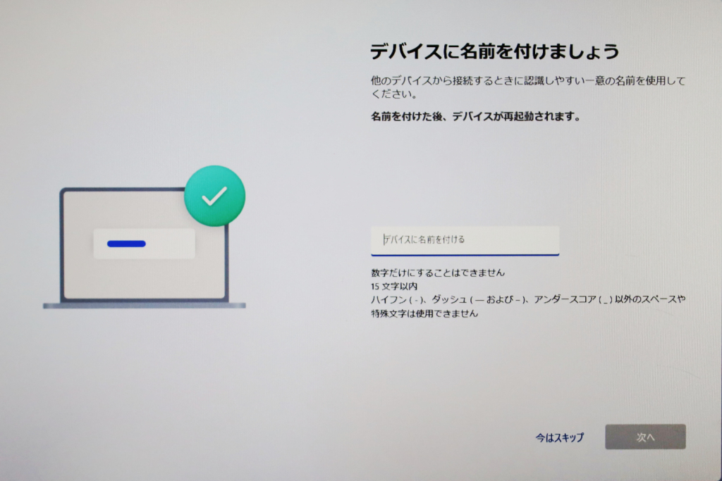 このデバイス名は、通常あまり気にする必要はないので、『今はスキップ』をクリックして飛ばしても問題ないです。(後から変更できます。)
