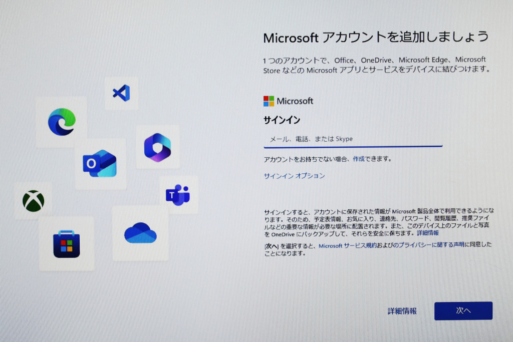 Microsftアカウントの情報が入力された状態になっていますので、そのまま『次へ』をクリックします。