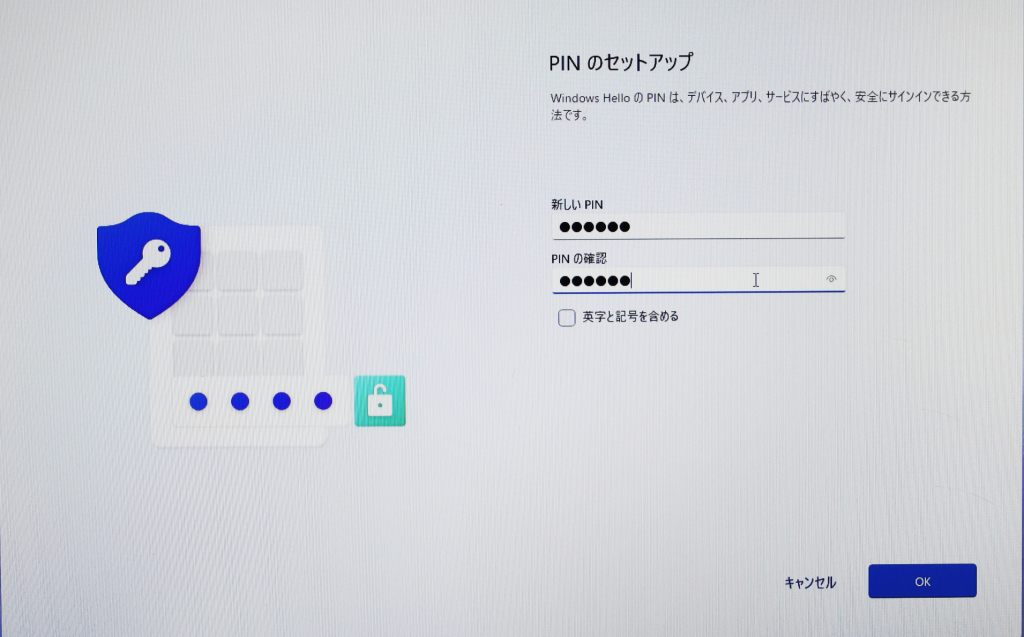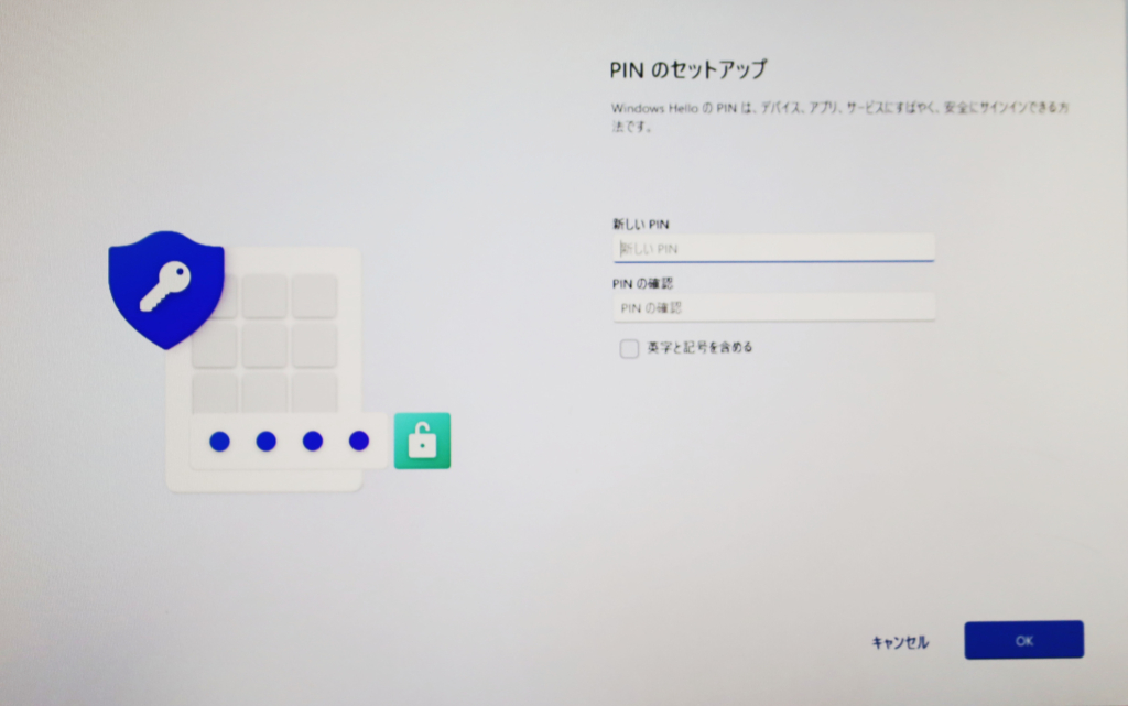 PINはパソコンの起動時のログインで、入力するパスワードの代わりとなるものです。設定しないとMicrosftアカウントのパスワードを入力してパソコンにログインすることになりますが、PINは4桁の数字など簡単な入力でログインできるようになり、PINはこのパソコンにしか保存されないため、セキュリティ面でも安全性が高まります。