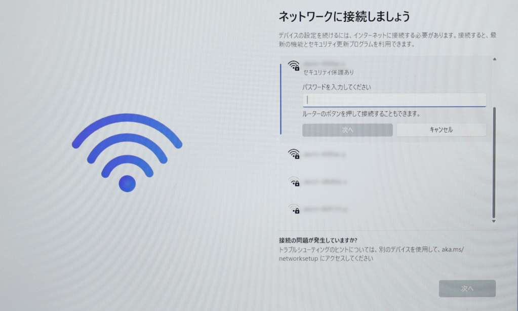 ネットワークに接続します。このディスクトップPCは有線LAN、無線LANのどちらでも接続可能ですが、ここでは無線LANを利用しWi-Fiで接続します。
