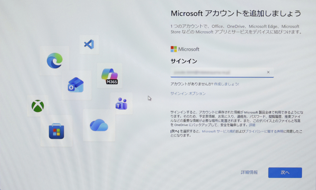 Microsftアカウントの情報が入力された状態になっていますので、そのまま『次へ』をクリックします。