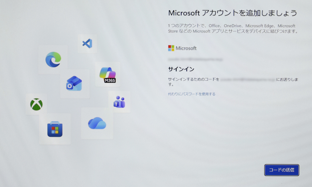 サインインするためのコードを「コードの送信」して認証するか、アカウントのパスワードを入植して認証するかを選択します。