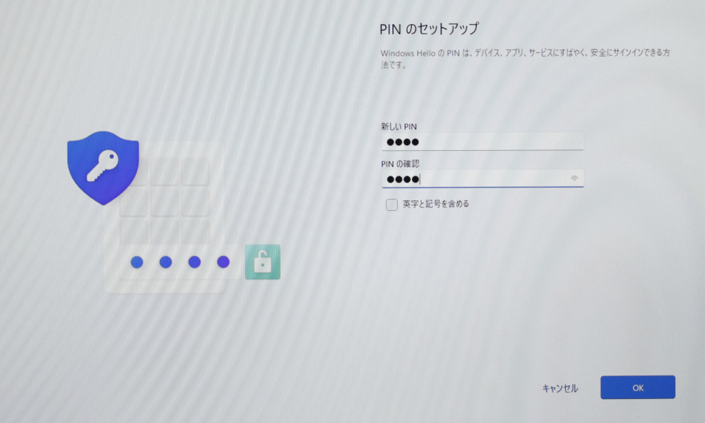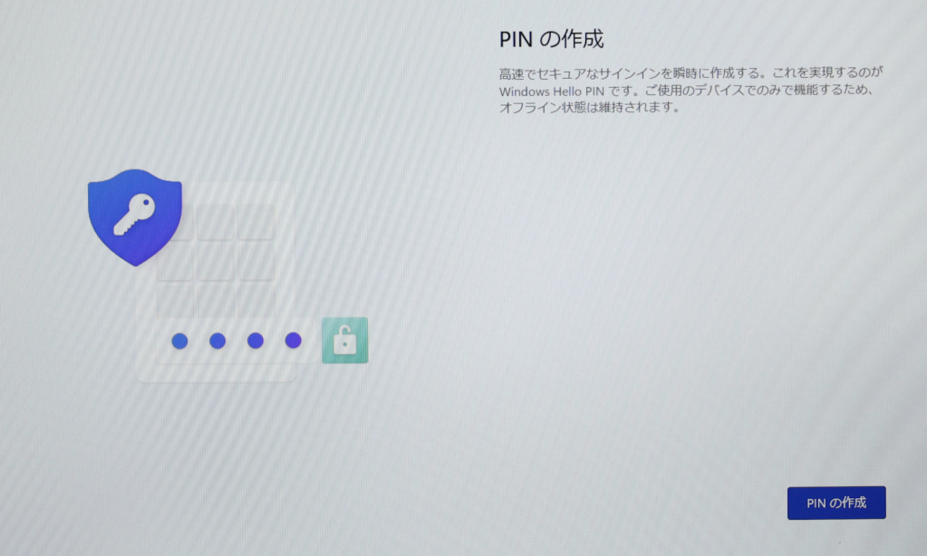 PINはパソコンの起動時のログインで、入力するパスワードの代わりとなるものです。設定しないとMicrosftアカウントのパスワードを入力してパソコンにログインすることになりますが、PINは4桁の数字など簡単な入力でログインできるようになり、PINはこのパソコンにしか保存されないため、セキュリティ面でも安全性が高まります。