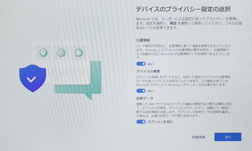 個人的には特に設定は変えないで、そのまま『次へ』をクリックで良いと思います。位置情報や診断データの送信など個人情報が送信されのが怖いと思われる方もいるかと思いますが、位置情報は「はい」を設定しないと、いろいろなサービスが利用できなくなり不便になるデメリットが大きいと思いますし、診断データなどは個人を特定する情報は送信されませんので、そんなに気にする必要はないと思います。
