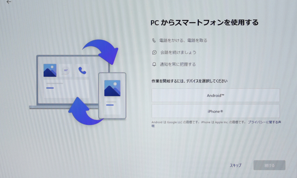 パソコンとスマートフォンと連携したいかたは、「Android」または「iPhone」を選択し『続ける』をクリックしてください。